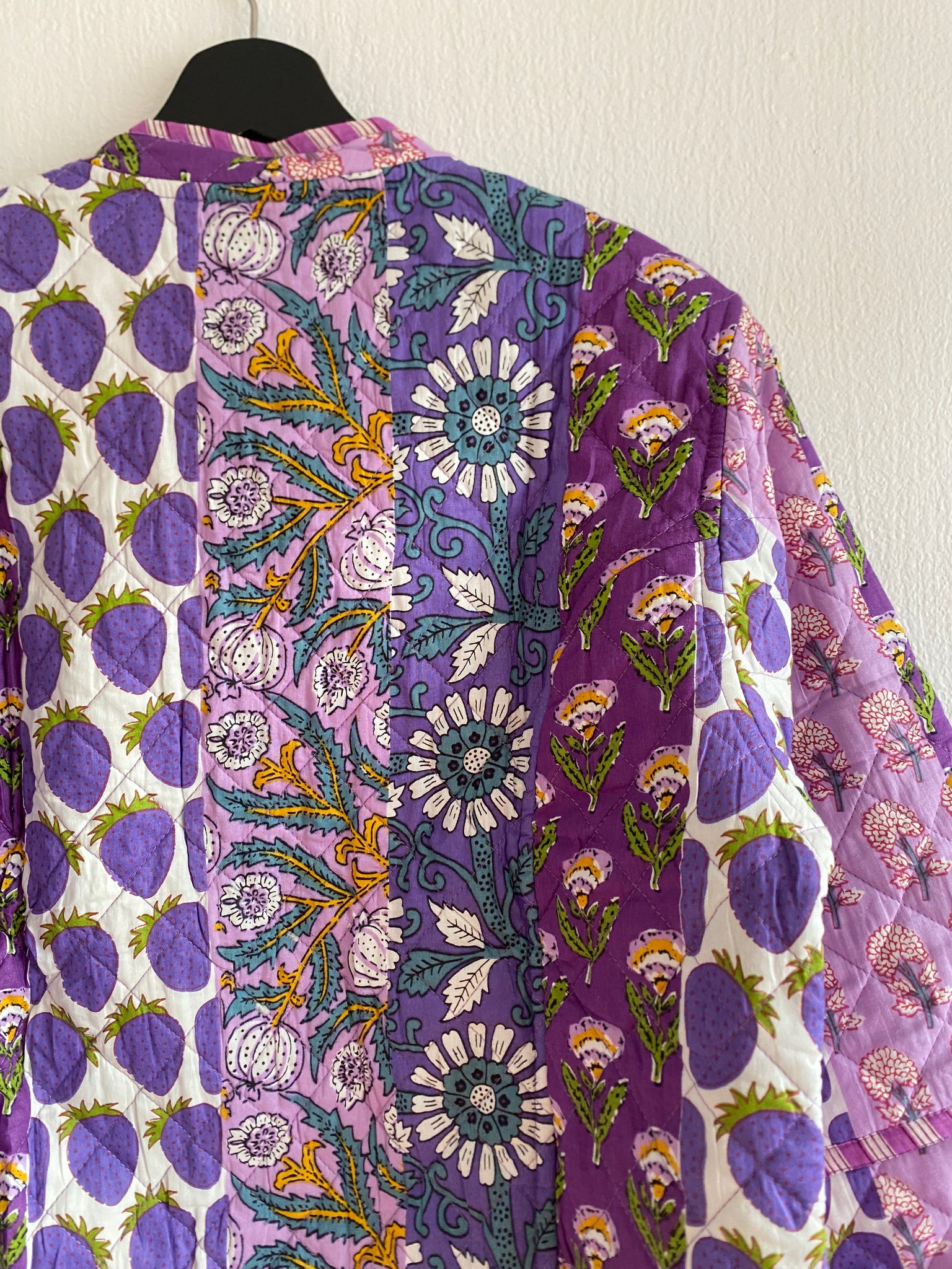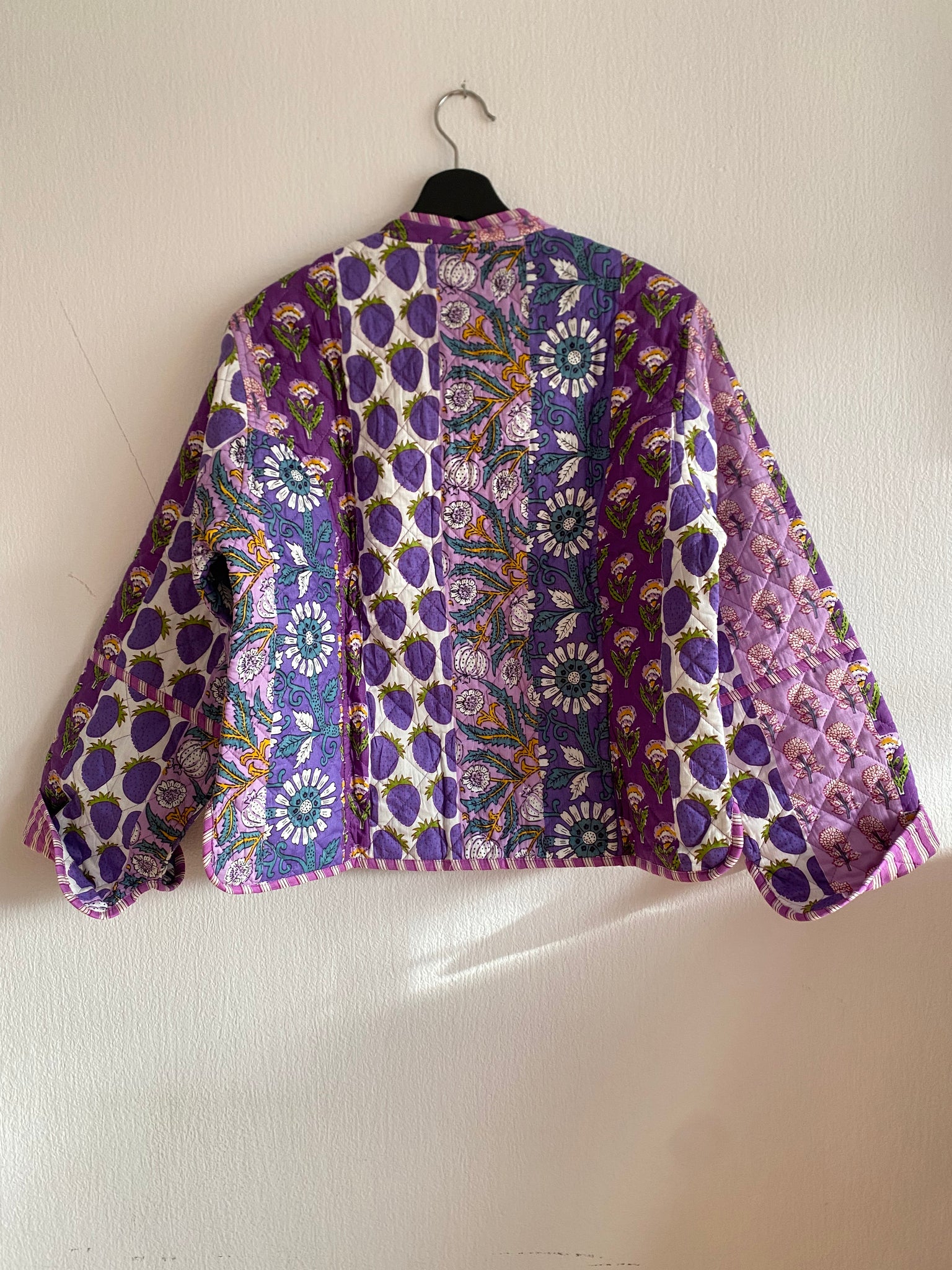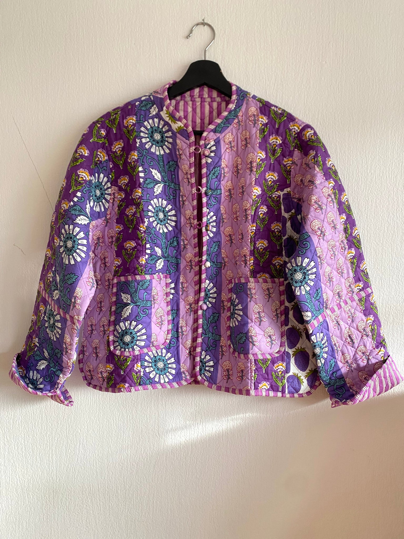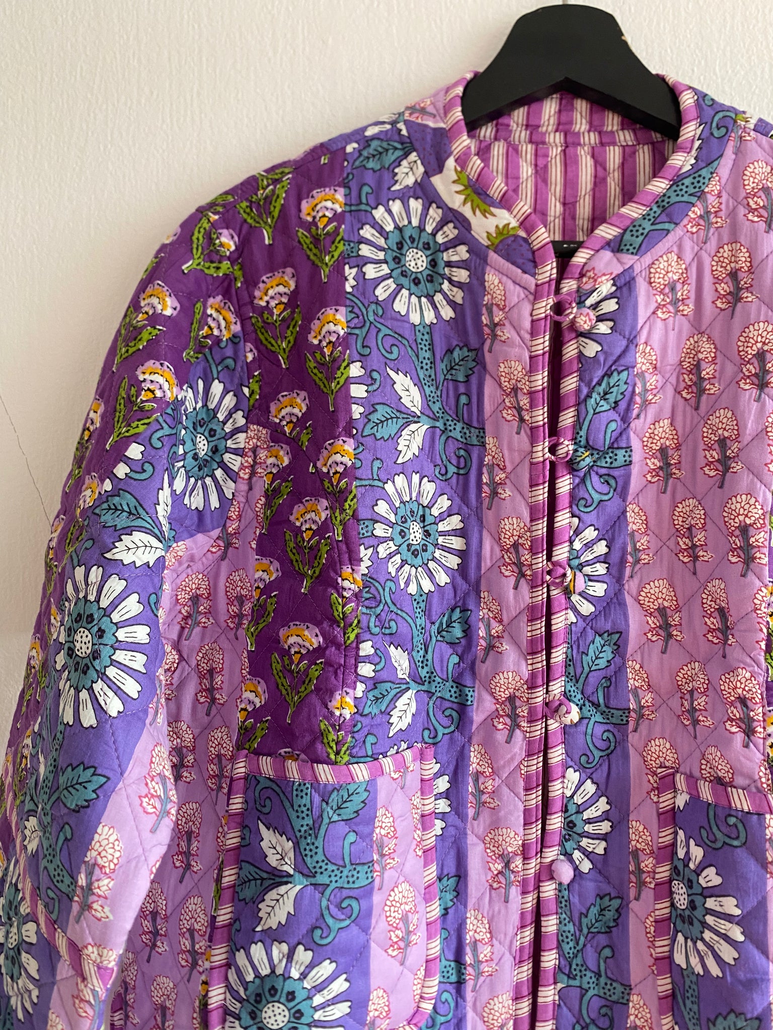Kort jacka i quiltad blocktryckt bomull med knappar i framtill. Två utanpåfickor på framsidan. Hellång ärm.