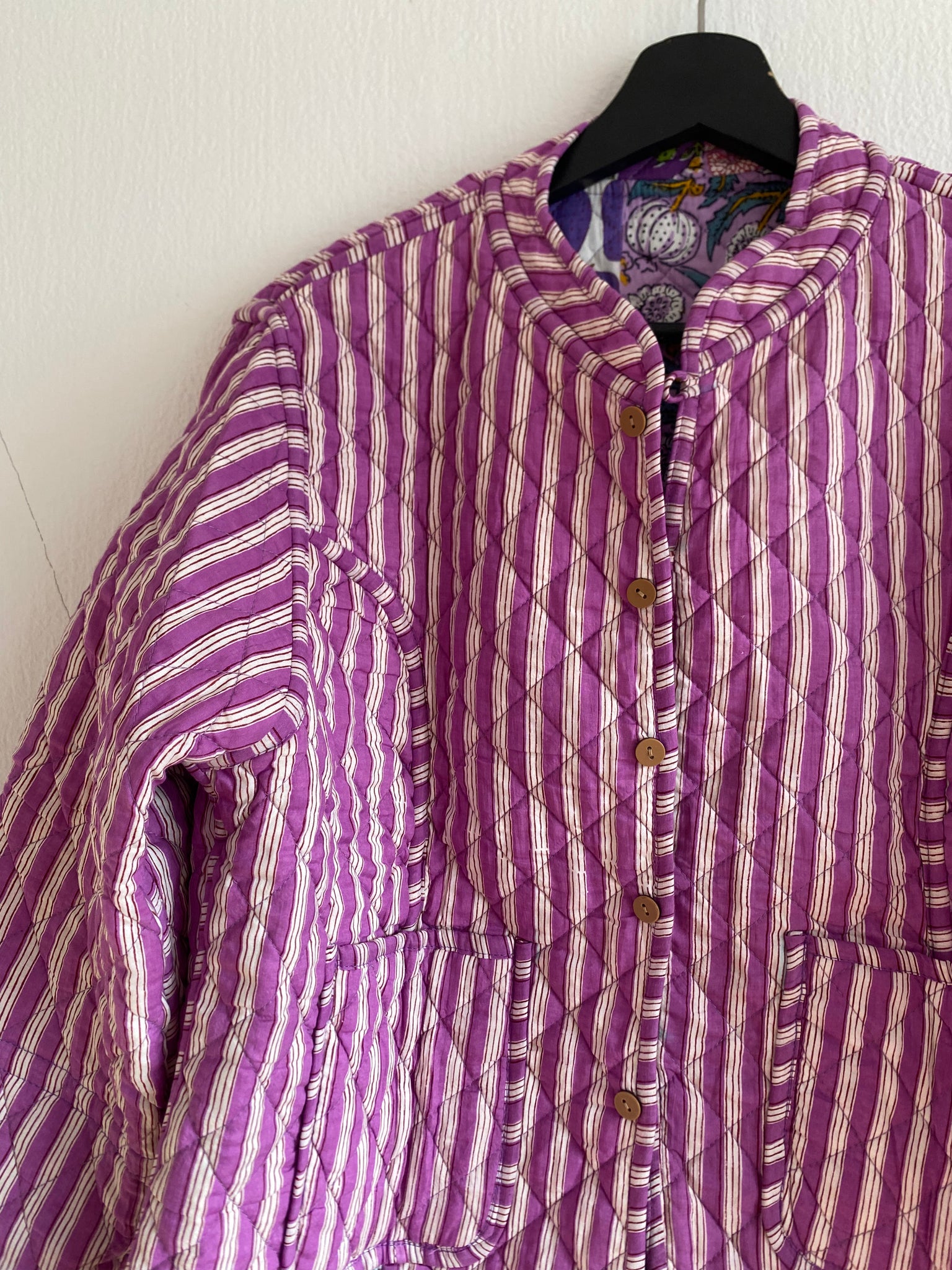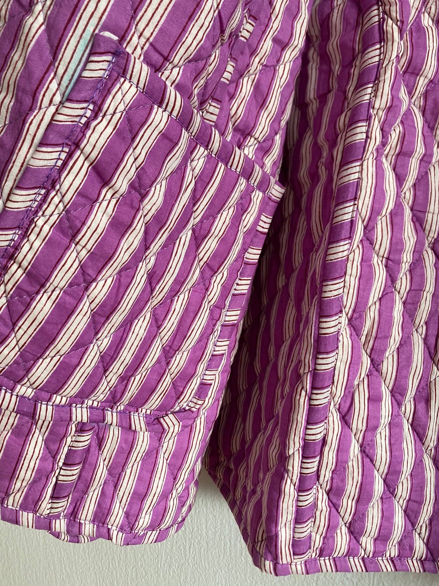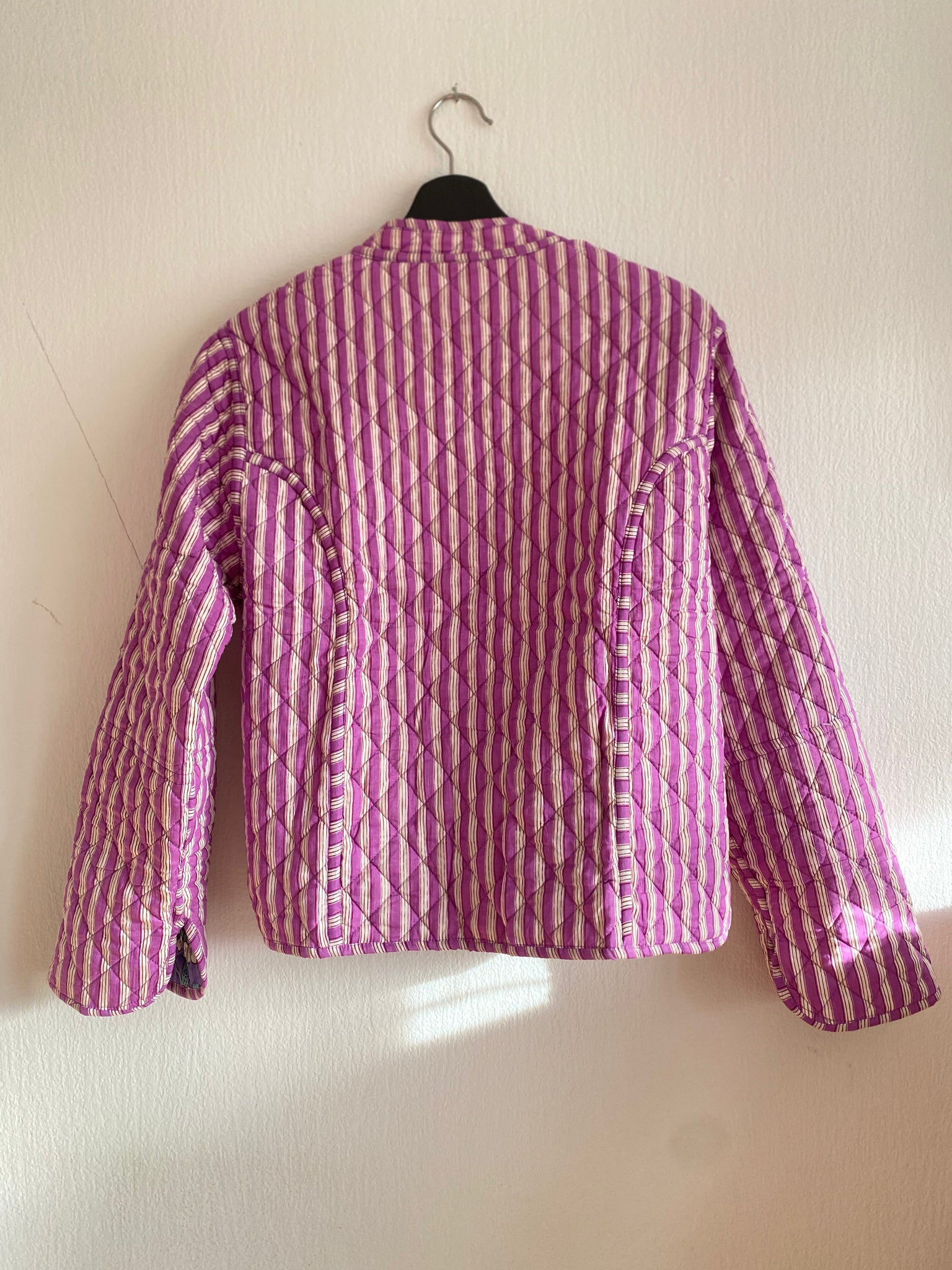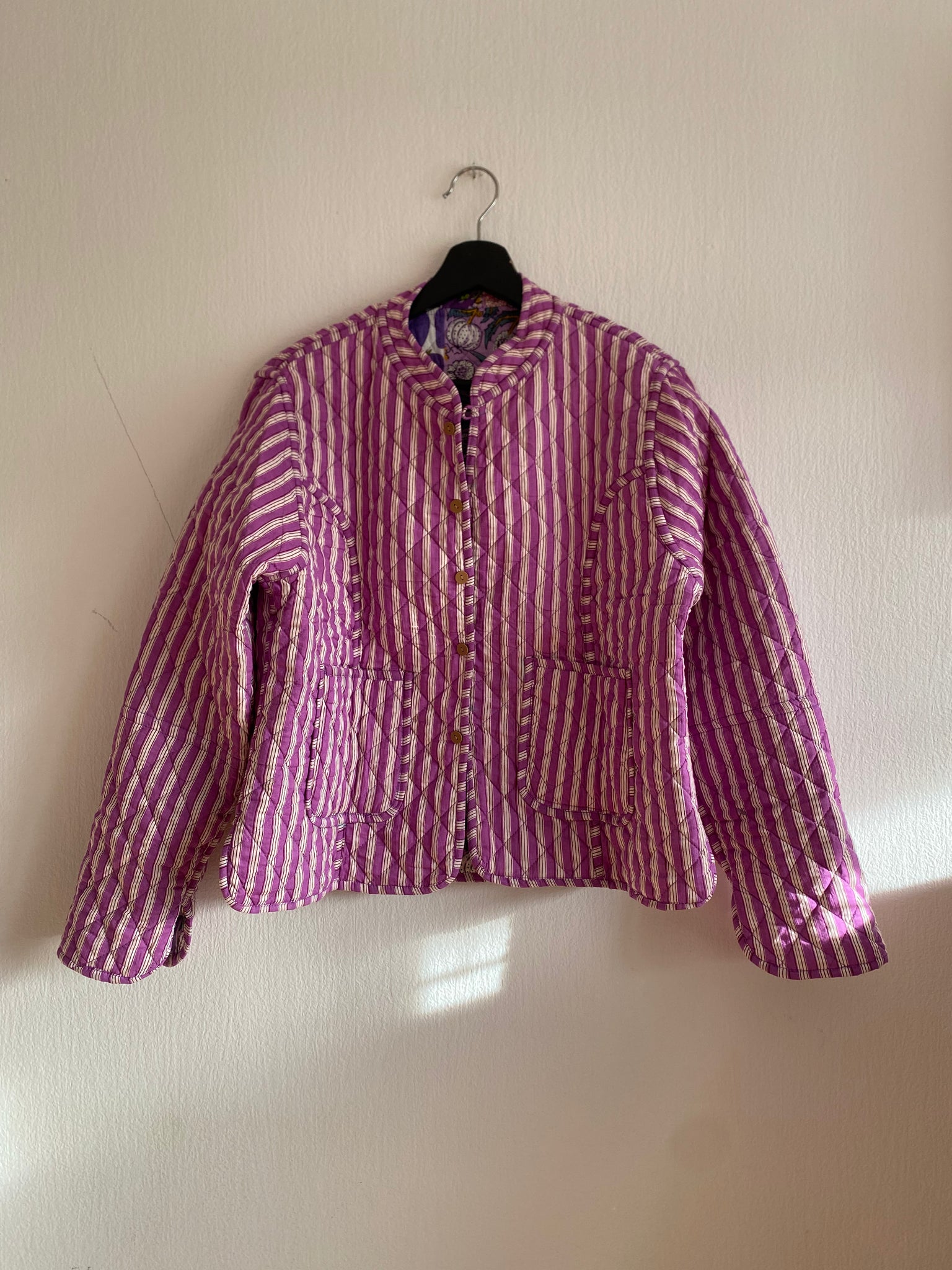 Kort jacka i quiltad blocktryckt bomull med knappar i framtill. Två utanpåfickor på framsidan. Hellång ärm.