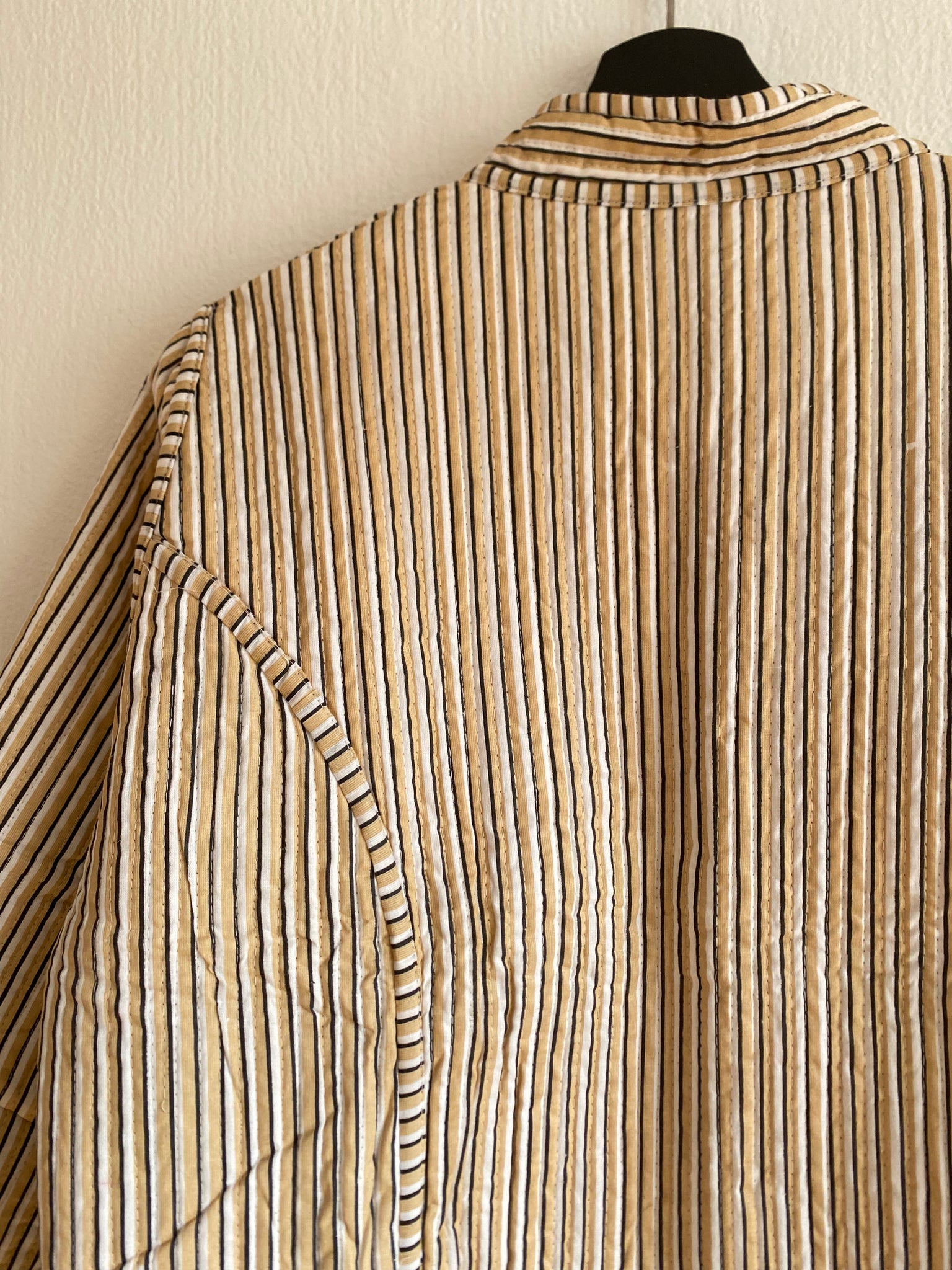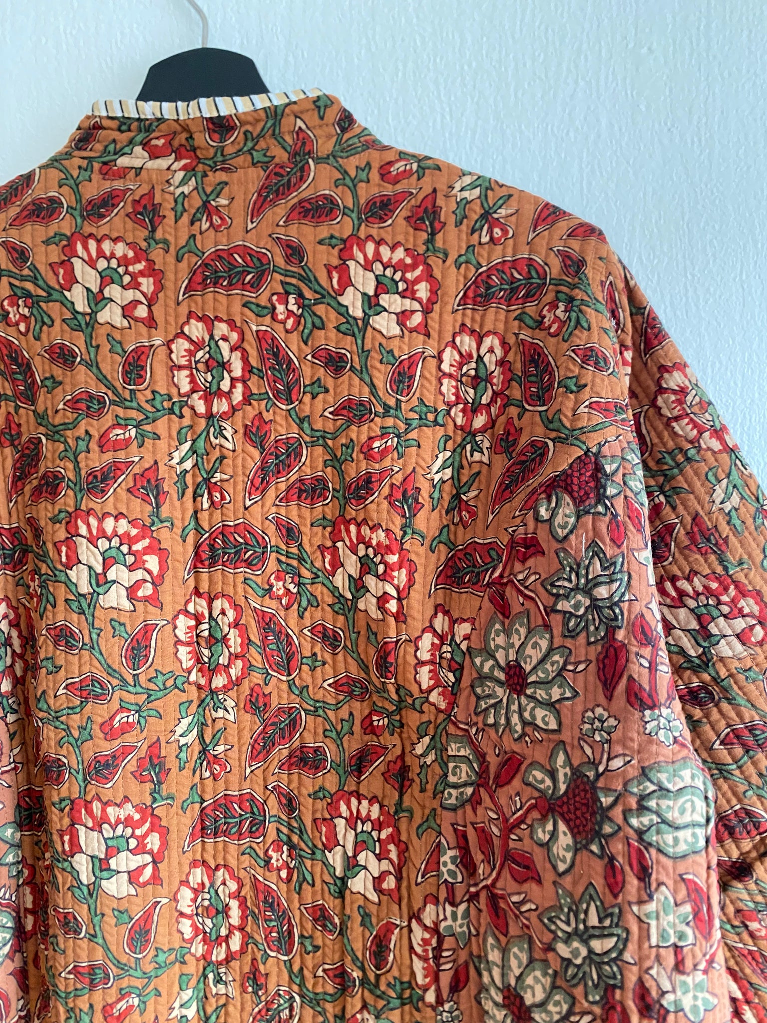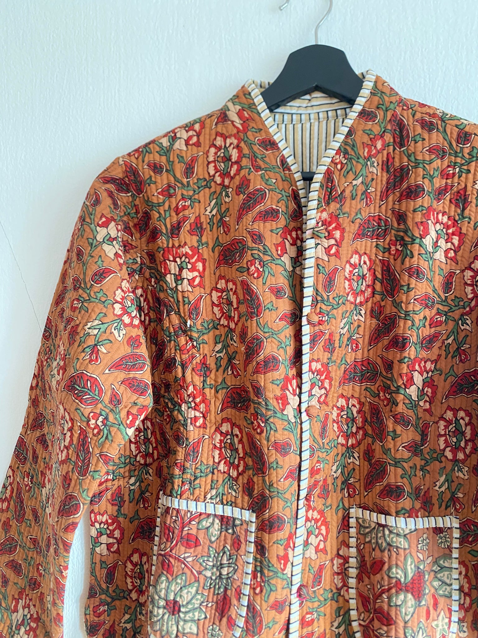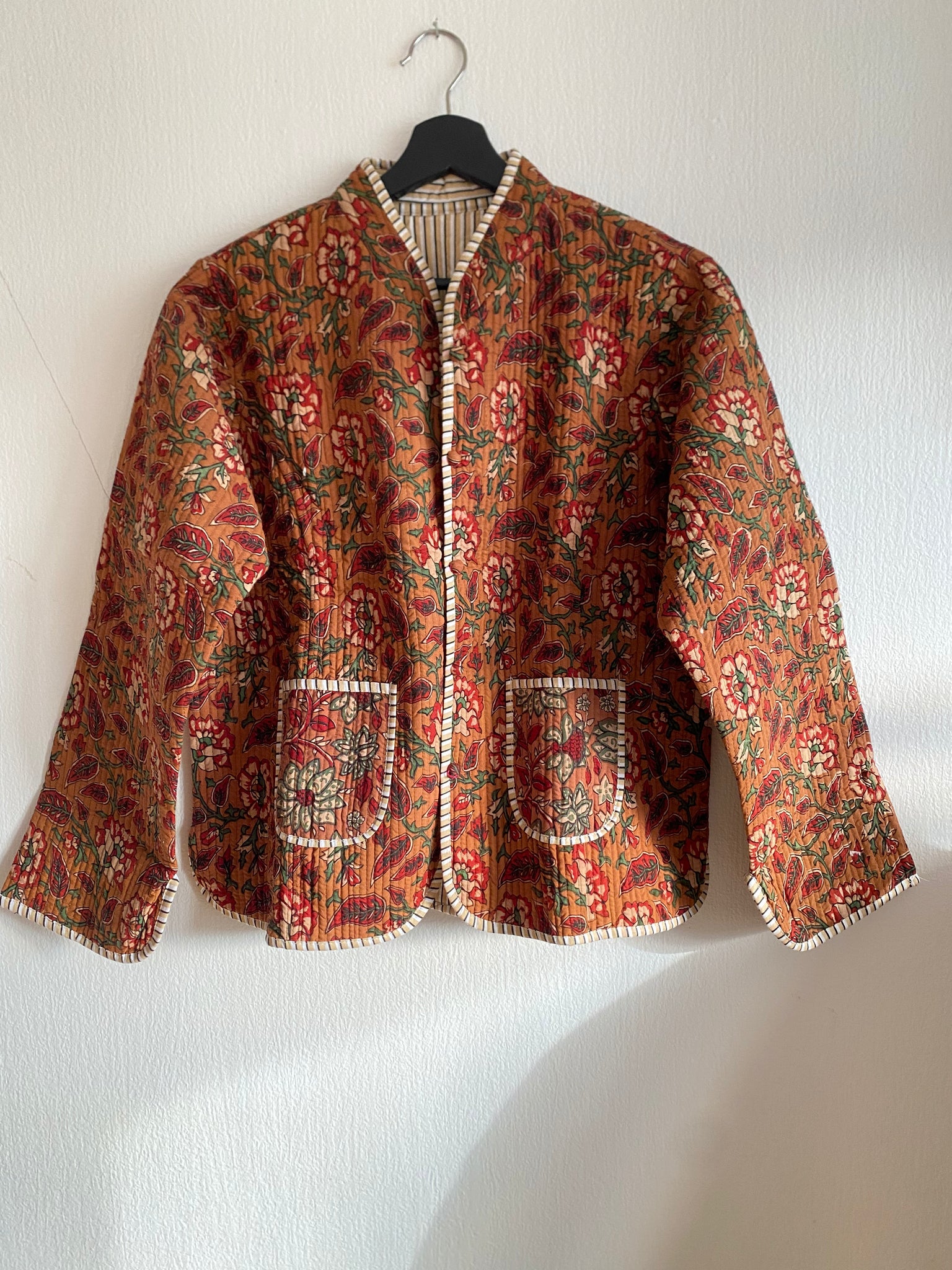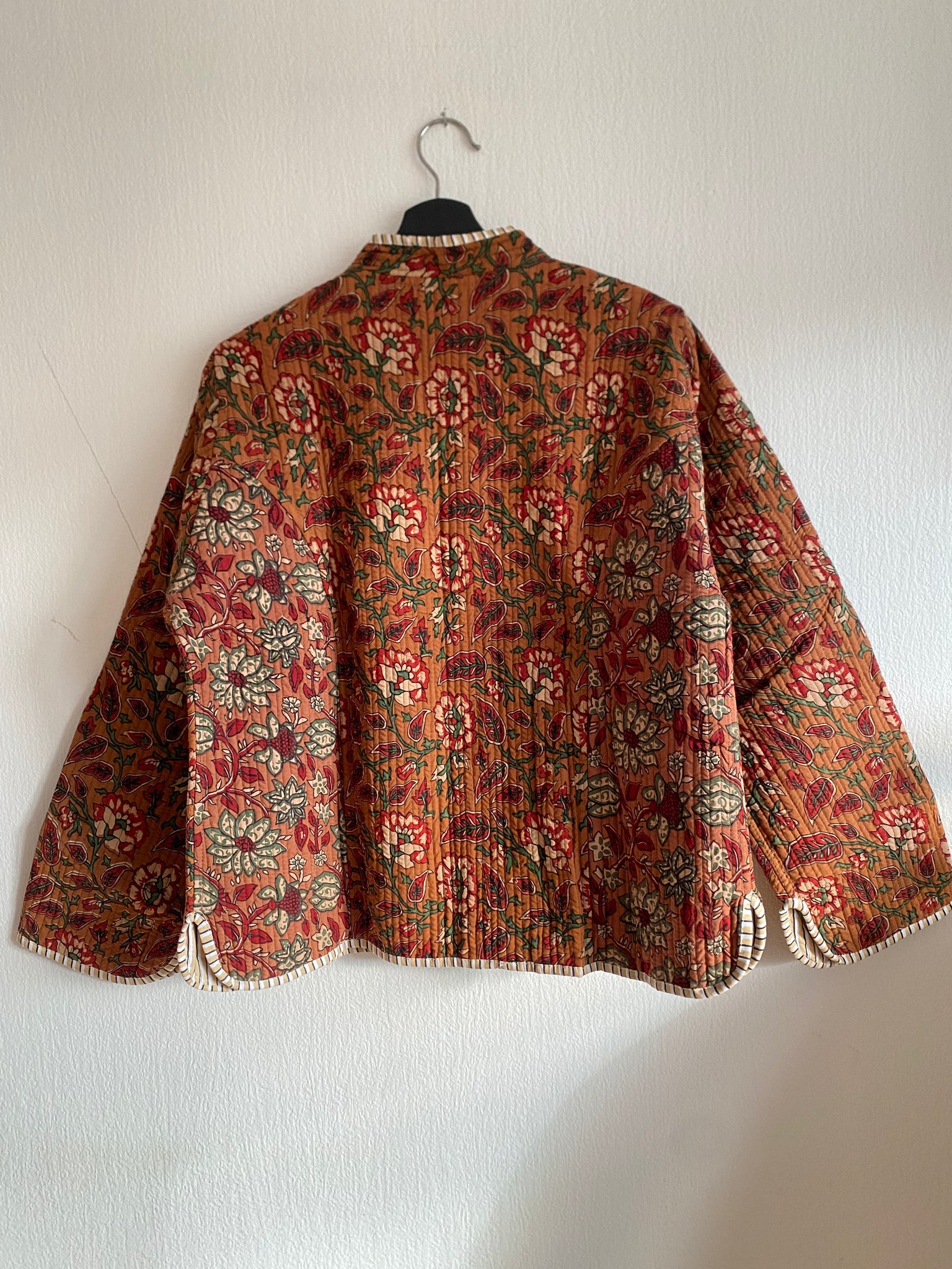 Kort jacka i quiltad blocktryckt bomull med knappar i framtill. Två utanpåfickor på framsidan. Hellång ärm.