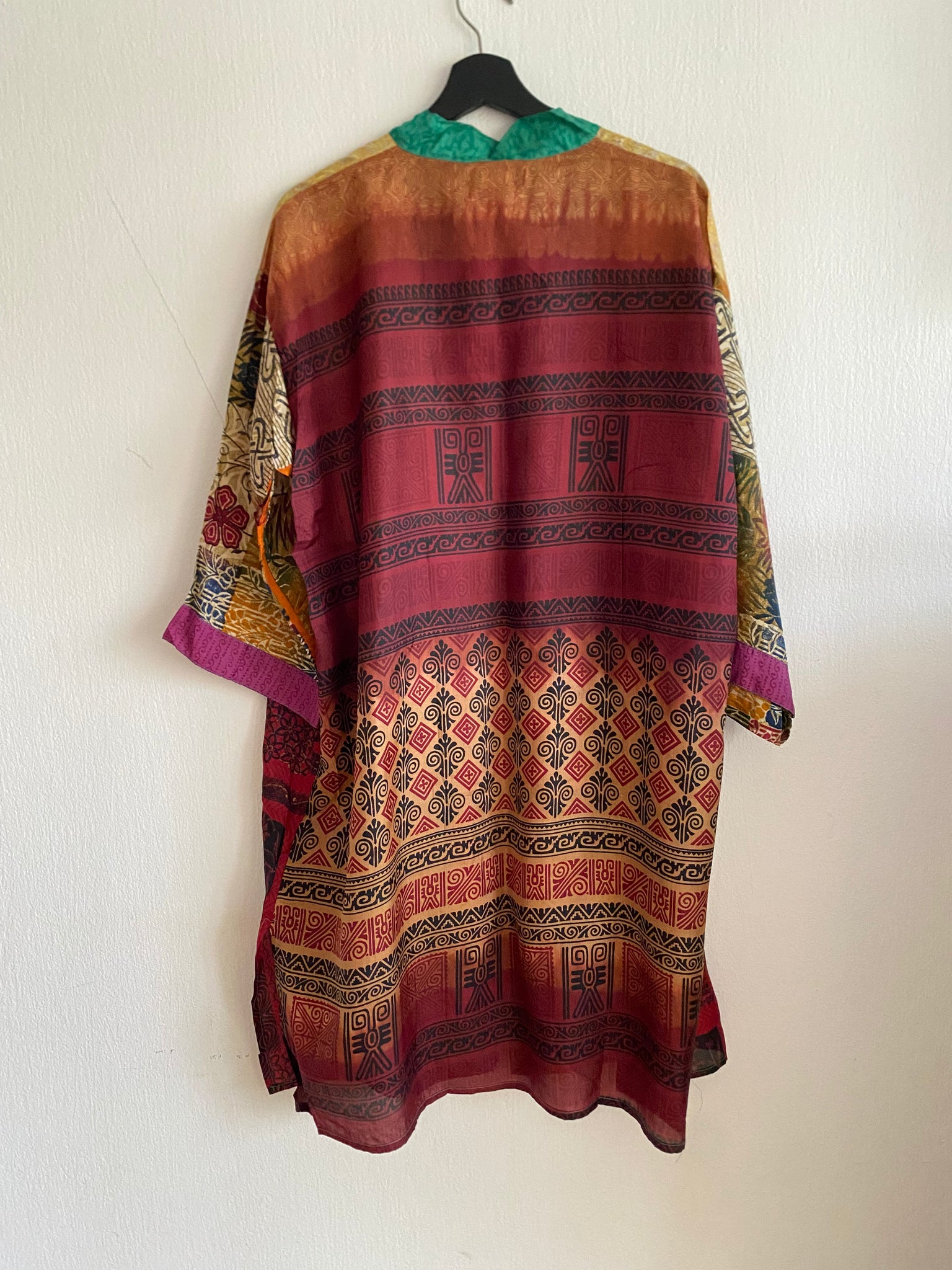 Kimono med underbara fina färgkombinationer. Materialet är återvunnet från sidensaaris som tidigare burits av indiska kvinnor. Varje exemplar är helt unikt i sitt uförande.