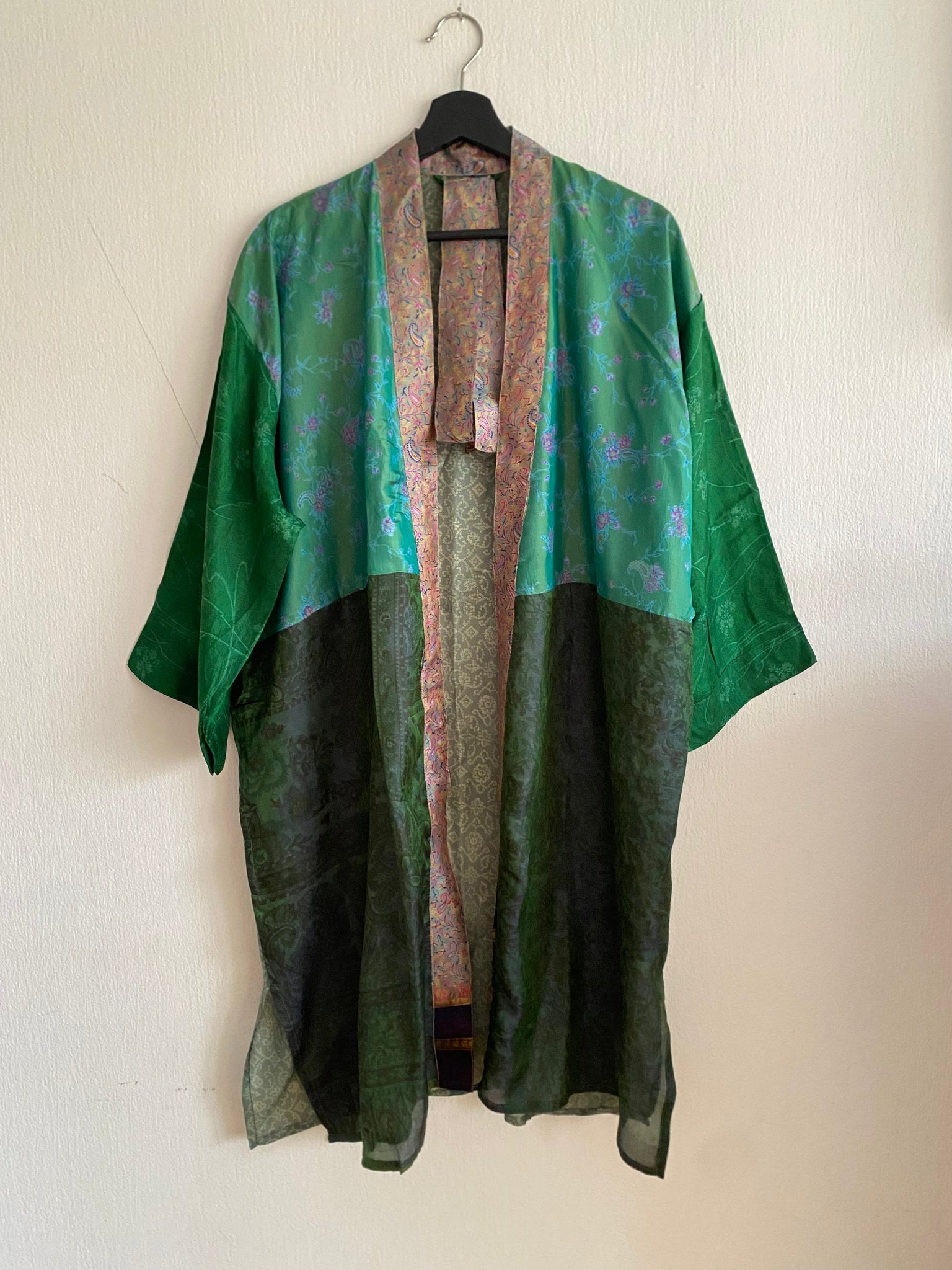 Kimono med underbara fina färgkombinationer. Materialet är återvunnet från sidensaaris som tidigare burits av indiska kvinnor. Varje exemplar är helt unikt i sitt uförande.