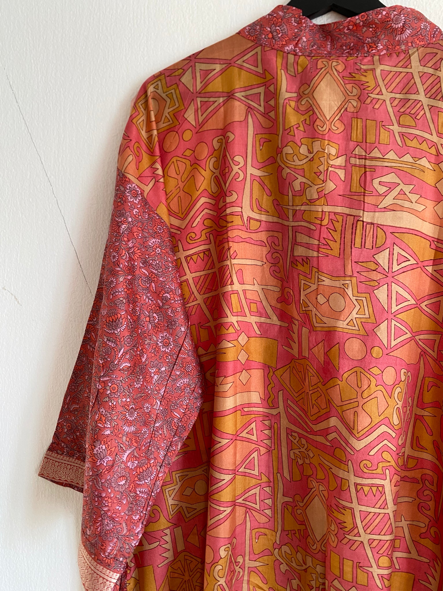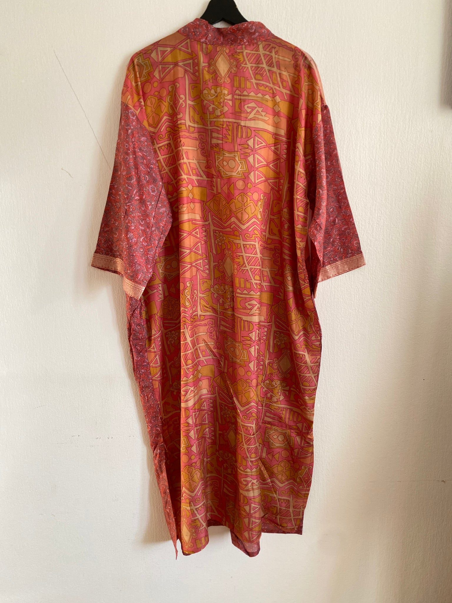 Kimono med underbara fina färgkombinationer. Materialet är återvunnet från sidensaaris som tidigare burits av indiska kvinnor. Varje exemplar är helt unikt i sitt uförande.