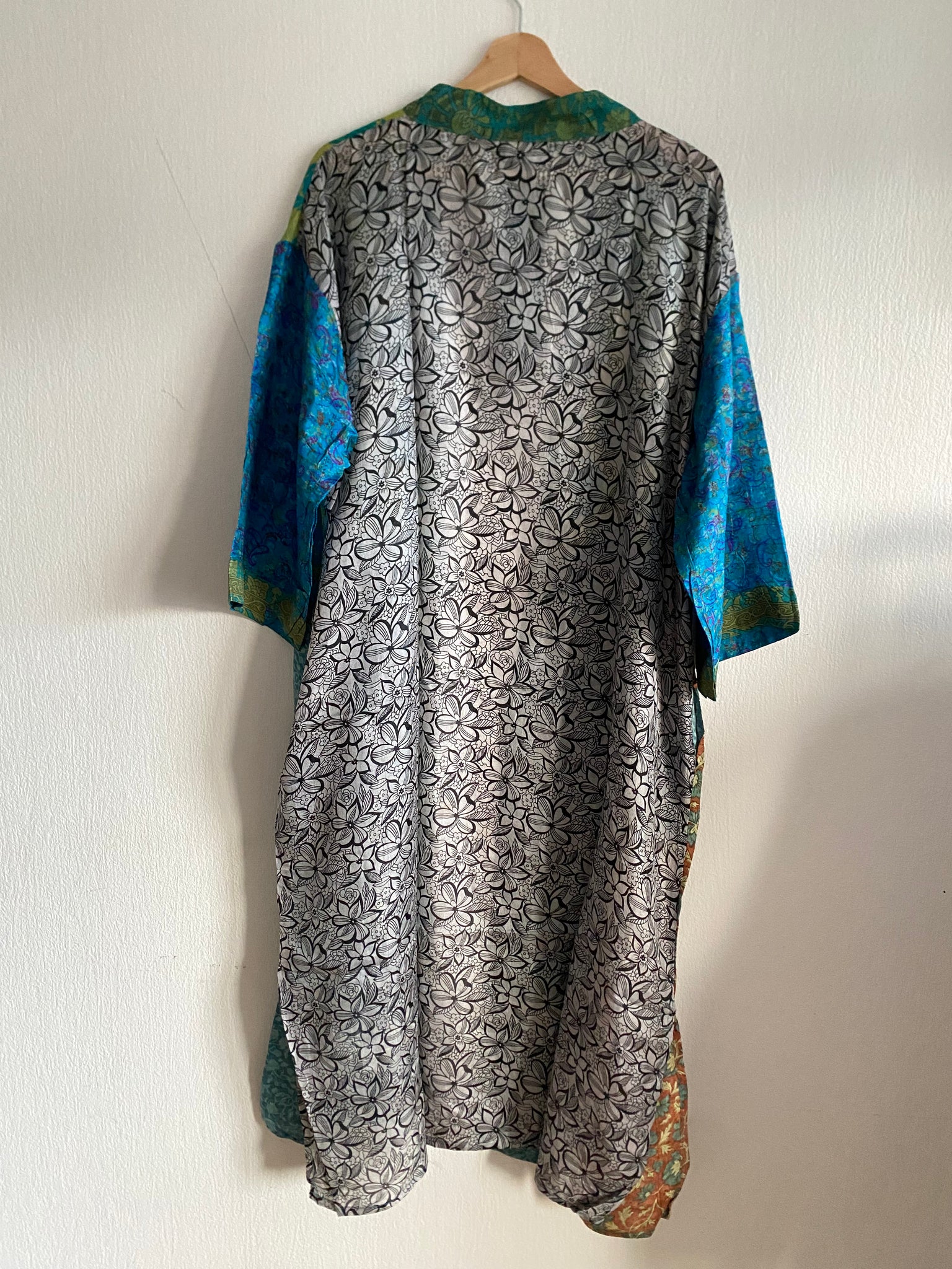 Kimono i underbara fina färgkombinationer. Materialet är återvunnet från sidensaaris som tidigare burits av indiska kvinnor. Varje exemplar är helt unikt i sitt uförande.