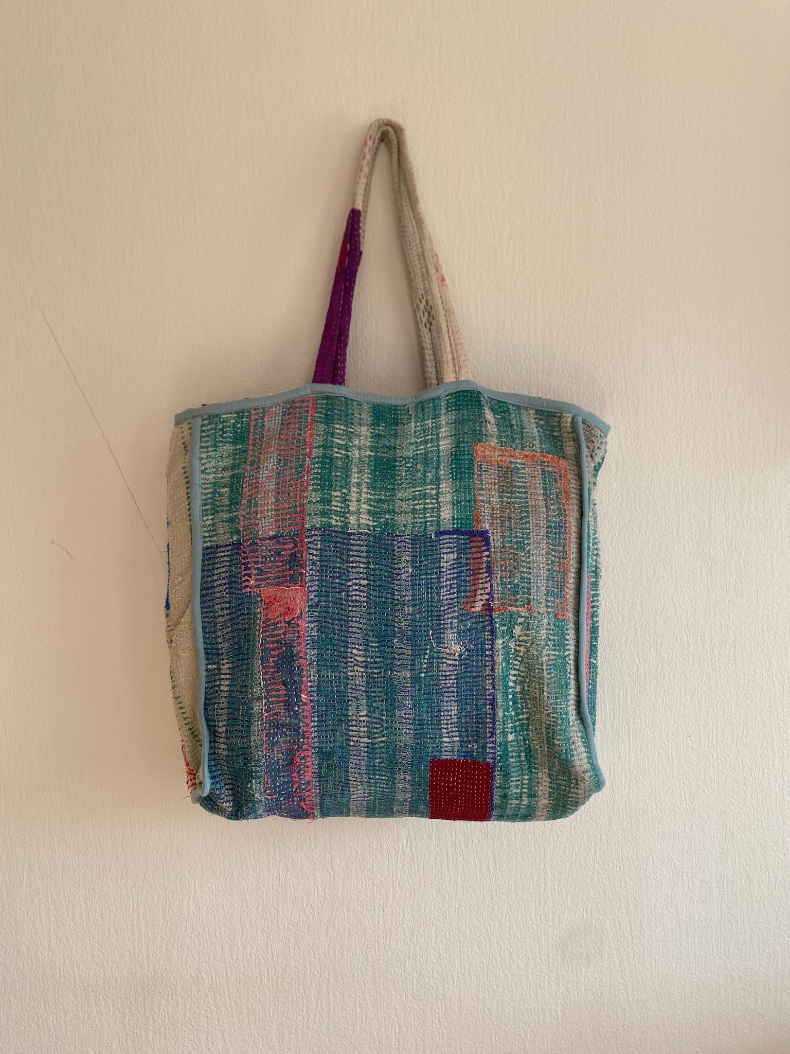 Unik väska i återvunnet vintage kanthatyg i bomull. Kanthatyg är sammansatta av flera lager gamla Saarityger och därefter handbroderat med kantha stygn. Väskan är rymlig i storleken och passar lika bra som en handväska i vardagen.