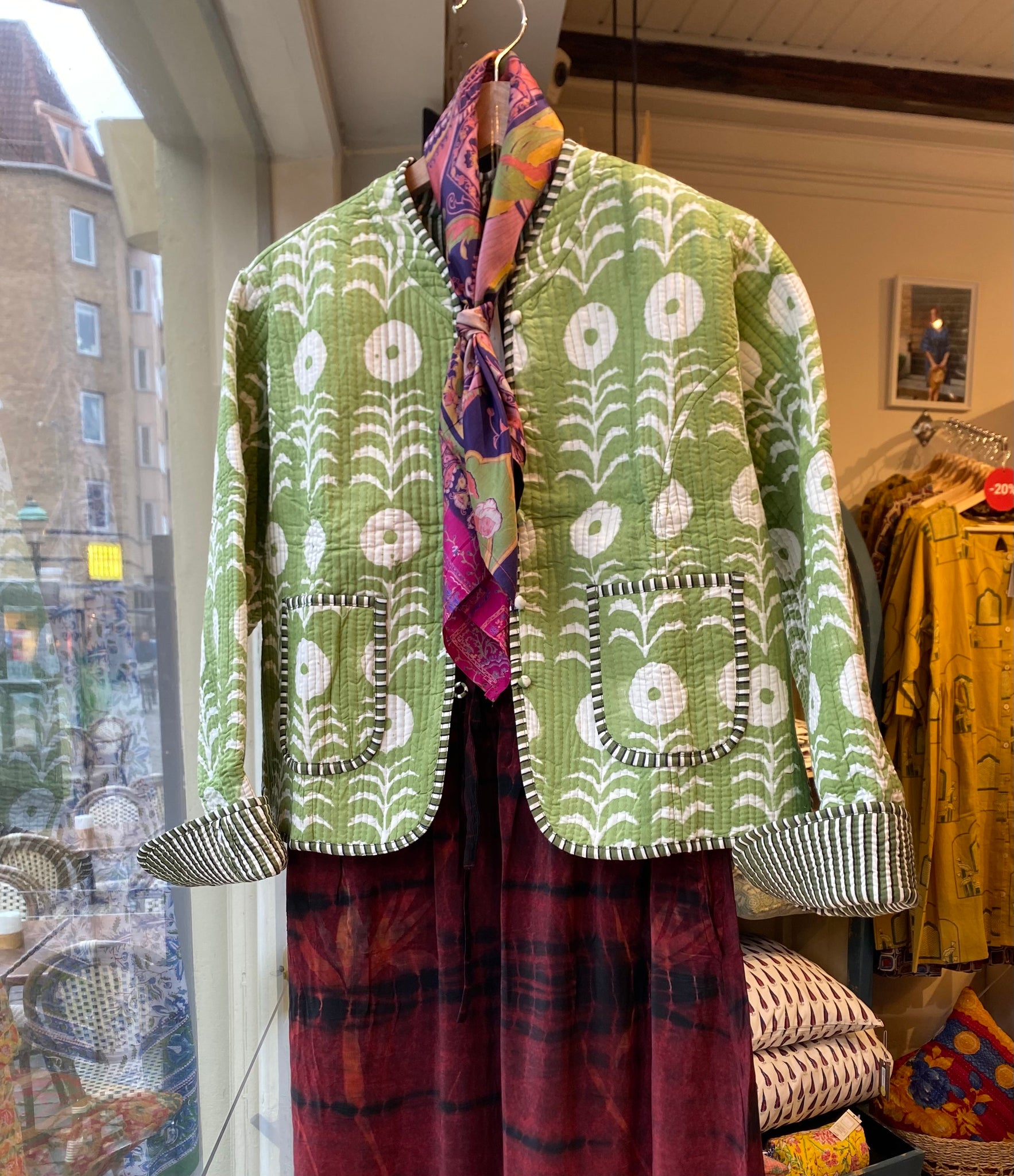 Kort jacka i quiltad blocktryckt bomull med knappar i framtill. Två utanpåfickor på framsidan. Hellång ärm.